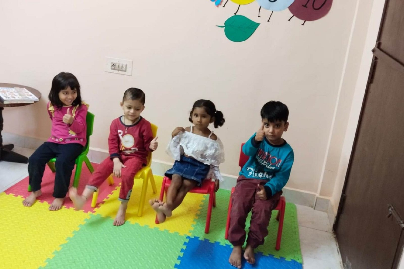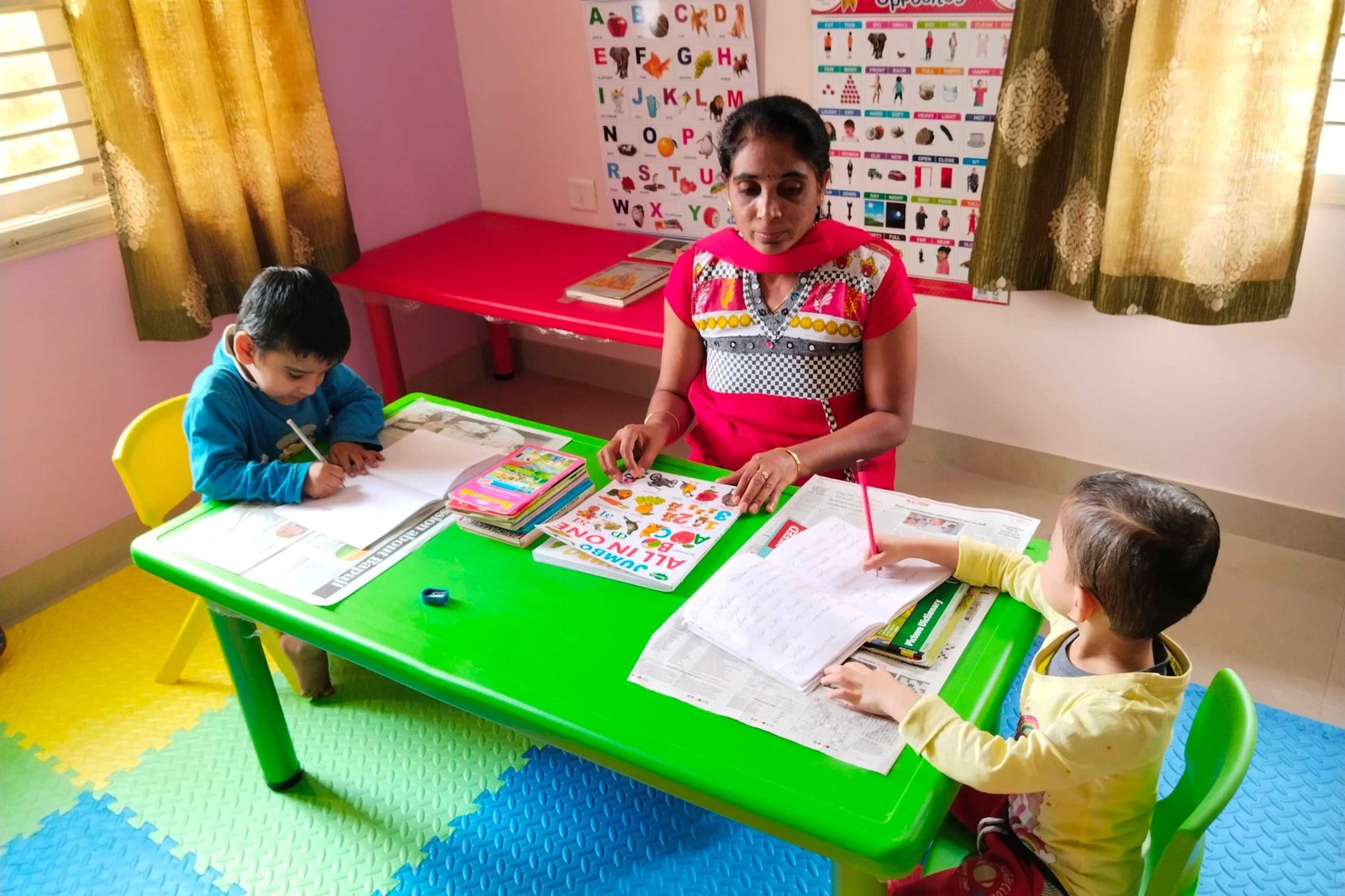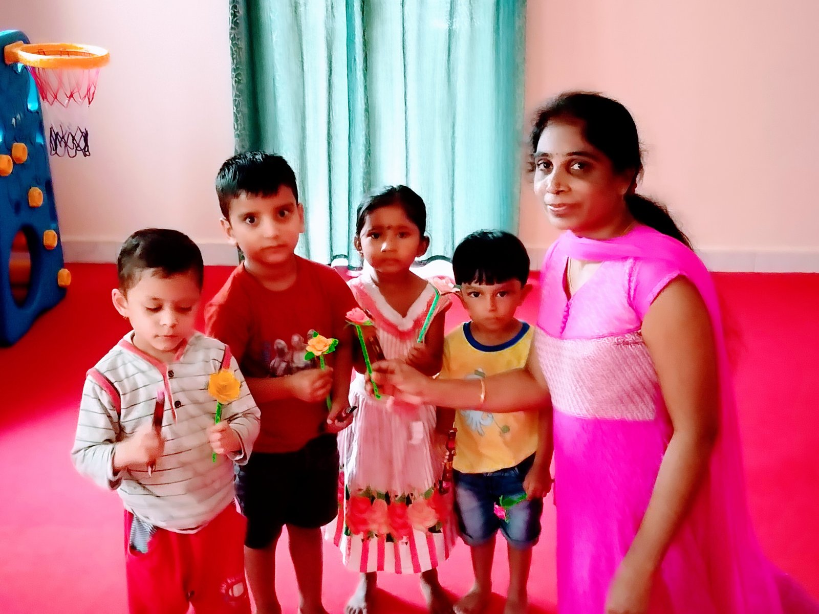 Sudha mam takes utmost care to maintain hygiene. She ensures all the kids eat well. Teaches them art and cratf and exercises.